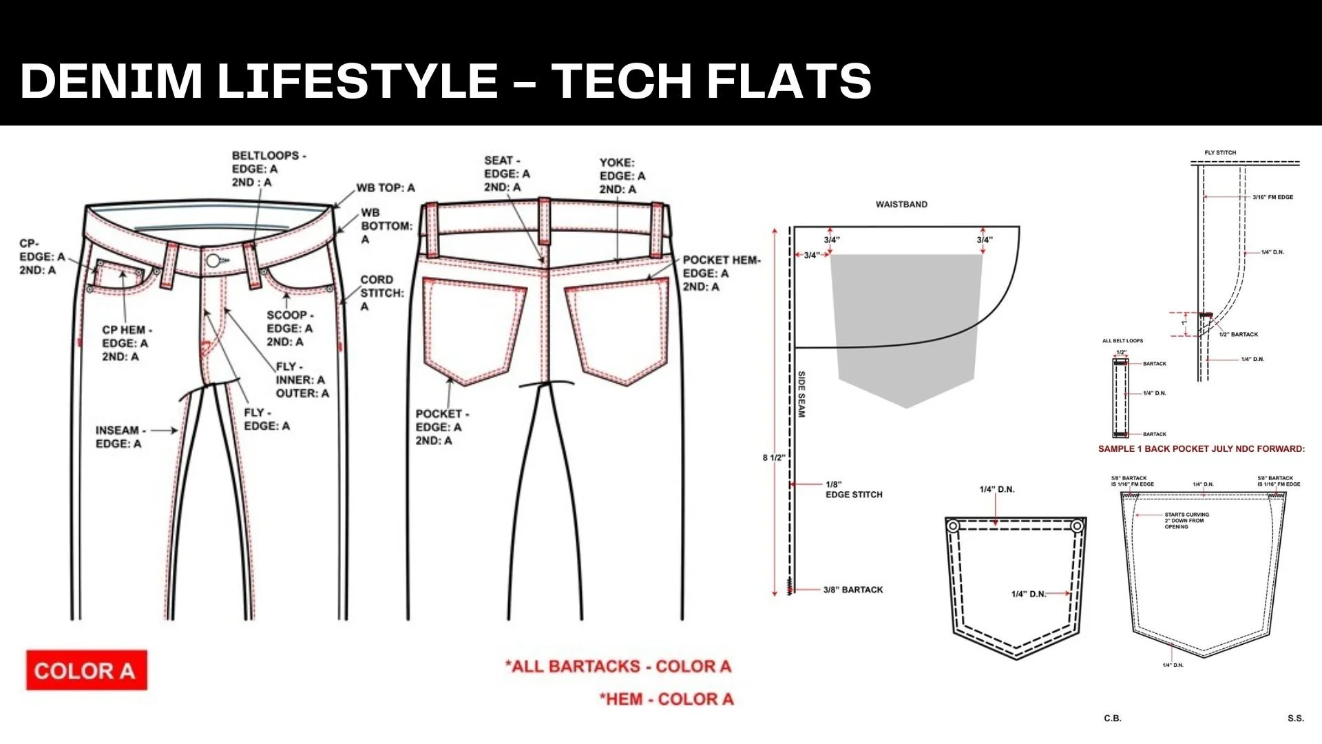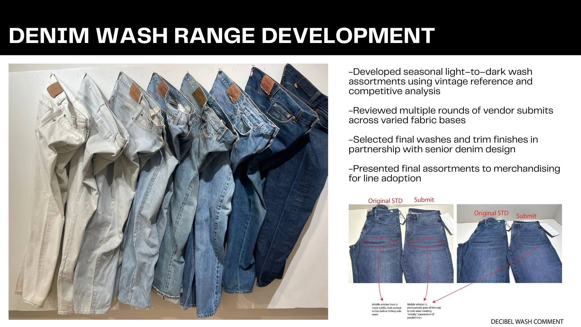 My role includes participating in live fit sessions and providing construction feedback to maintain consistency, quality, and design integrity across size runs. I also conduct competitive analysis and trend research, attend denim-focused trade shows, and work directly with mills to source fabrics that align with brand identity, performance needs, and margin targets. This position has strengthened my ability to balance creativity with commercial realities, speed, and precision within a large-scale, fast-paced retail environment.